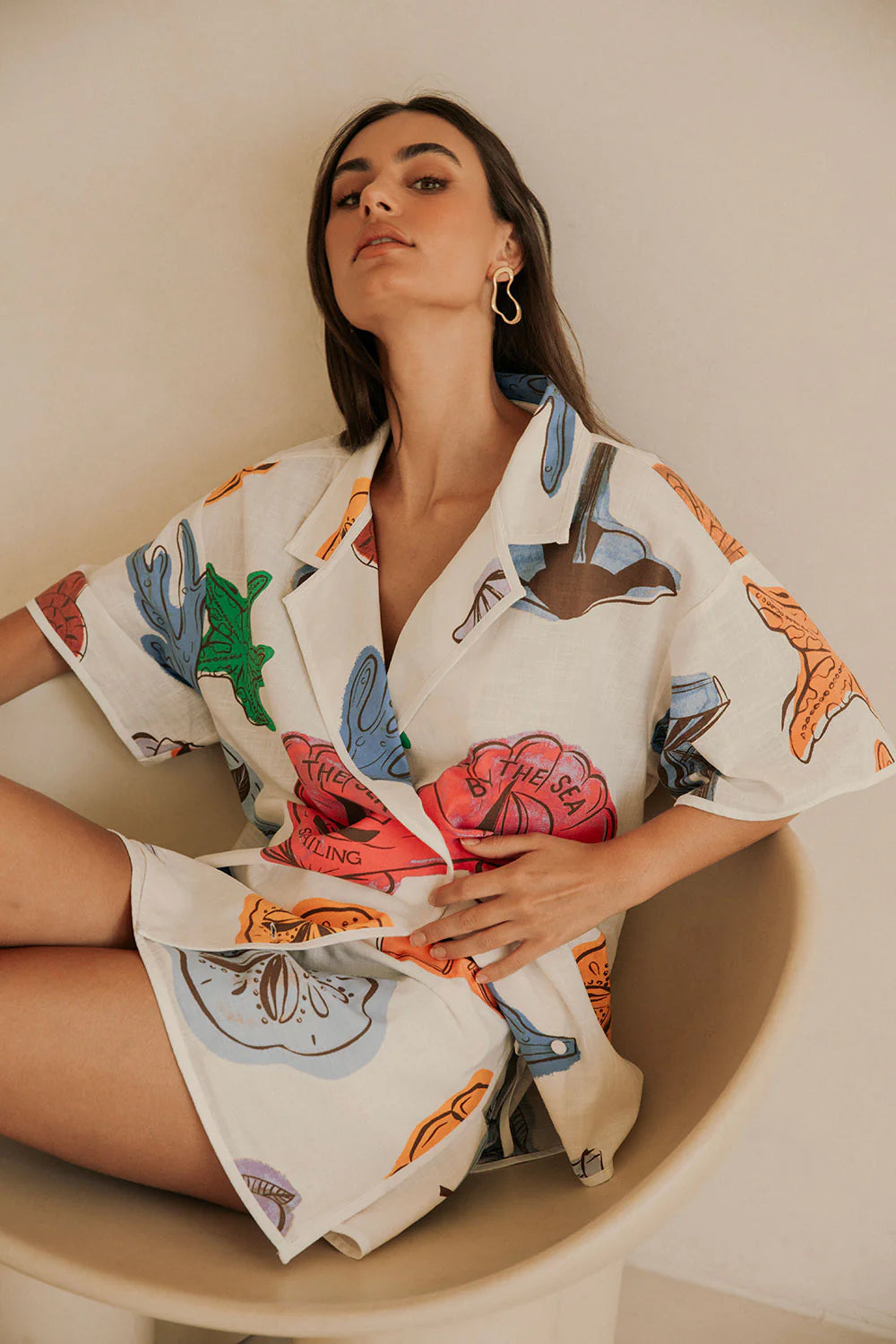 A breezy, coastal-inspired ensemble, the Avery Skirt Set captures the carefree spirit of summer with its exclusive By The Sea print and crisp, tailored details. Crafted from premium cotton slub fabric, this two-piece set blends retro charm with modern ease, perfect for sunny days by the shore or stylish city strolls.