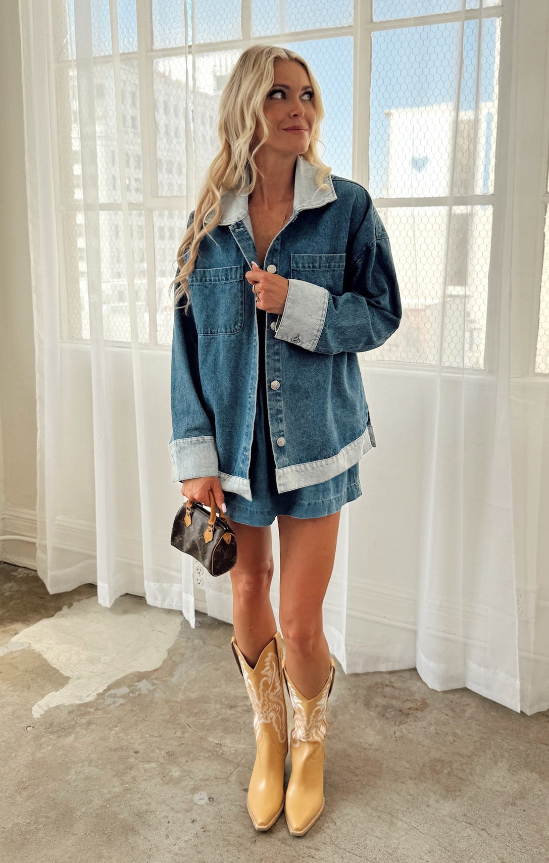 The Caldwell Jacket is your new go-to that pulls any outfit together. This barn-style denim shacket features front patch pockets, classic buttons, and contrast trims in a lighter wash for an effortless, lived-in look. The oversized fit keeps it comfy, cool, and easy to layer.