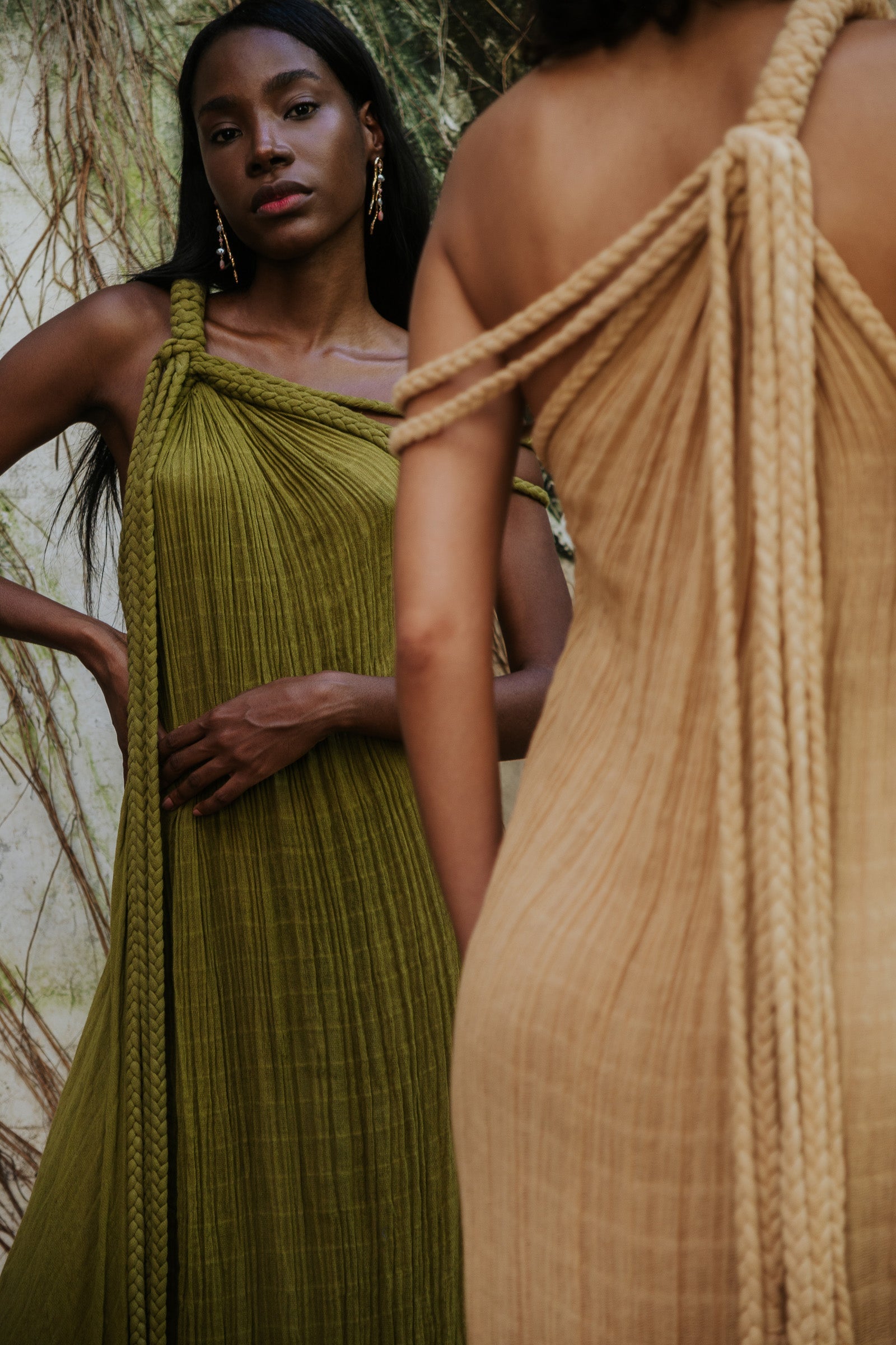 A strong braided one shoulder harness design meant to make a statement! The softly draping braids on the opposite shoulder make for a truly eponymous asymmetrical look. Cascading decorative braids can also be styled to create multiple belted effects.