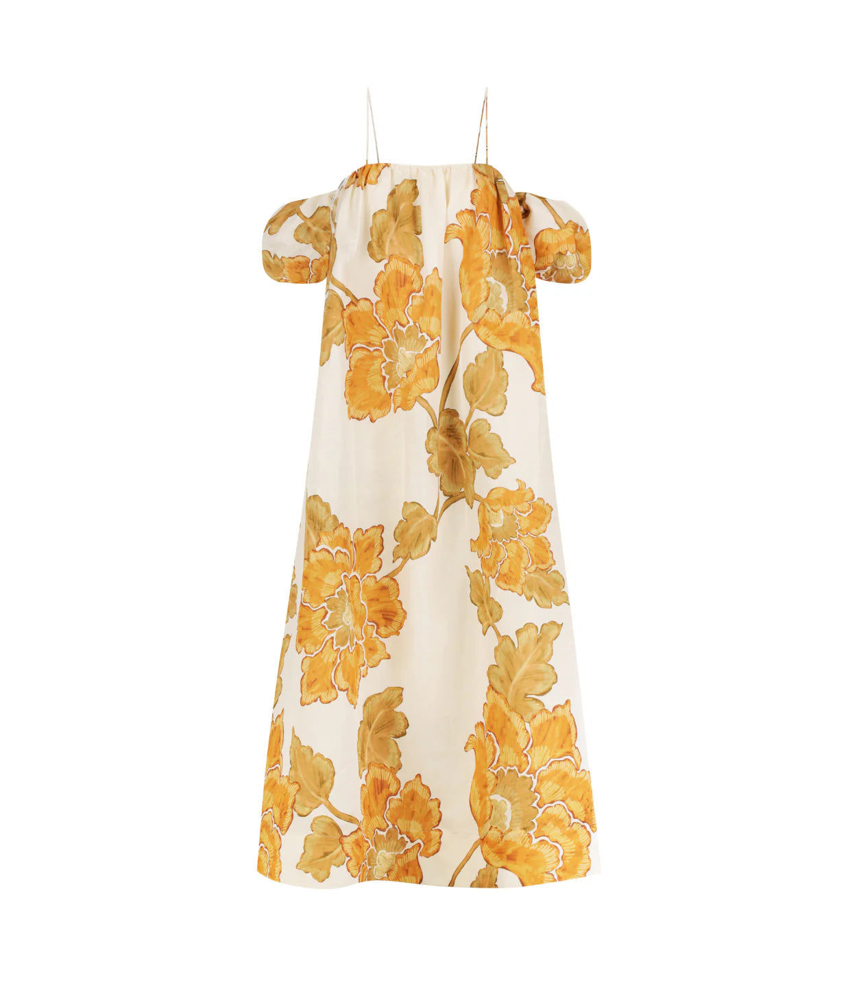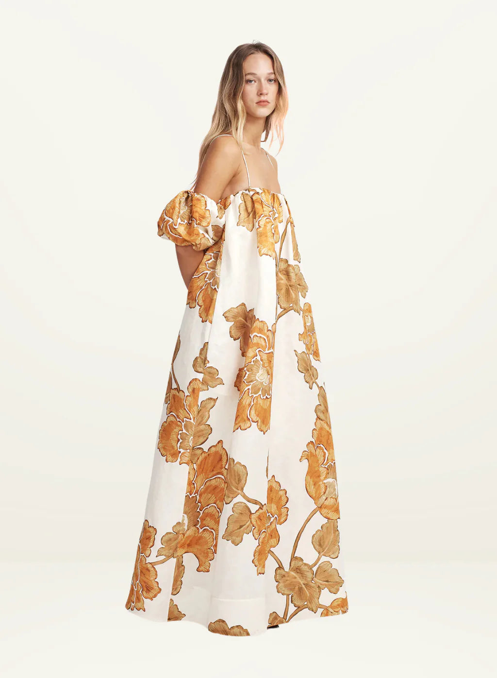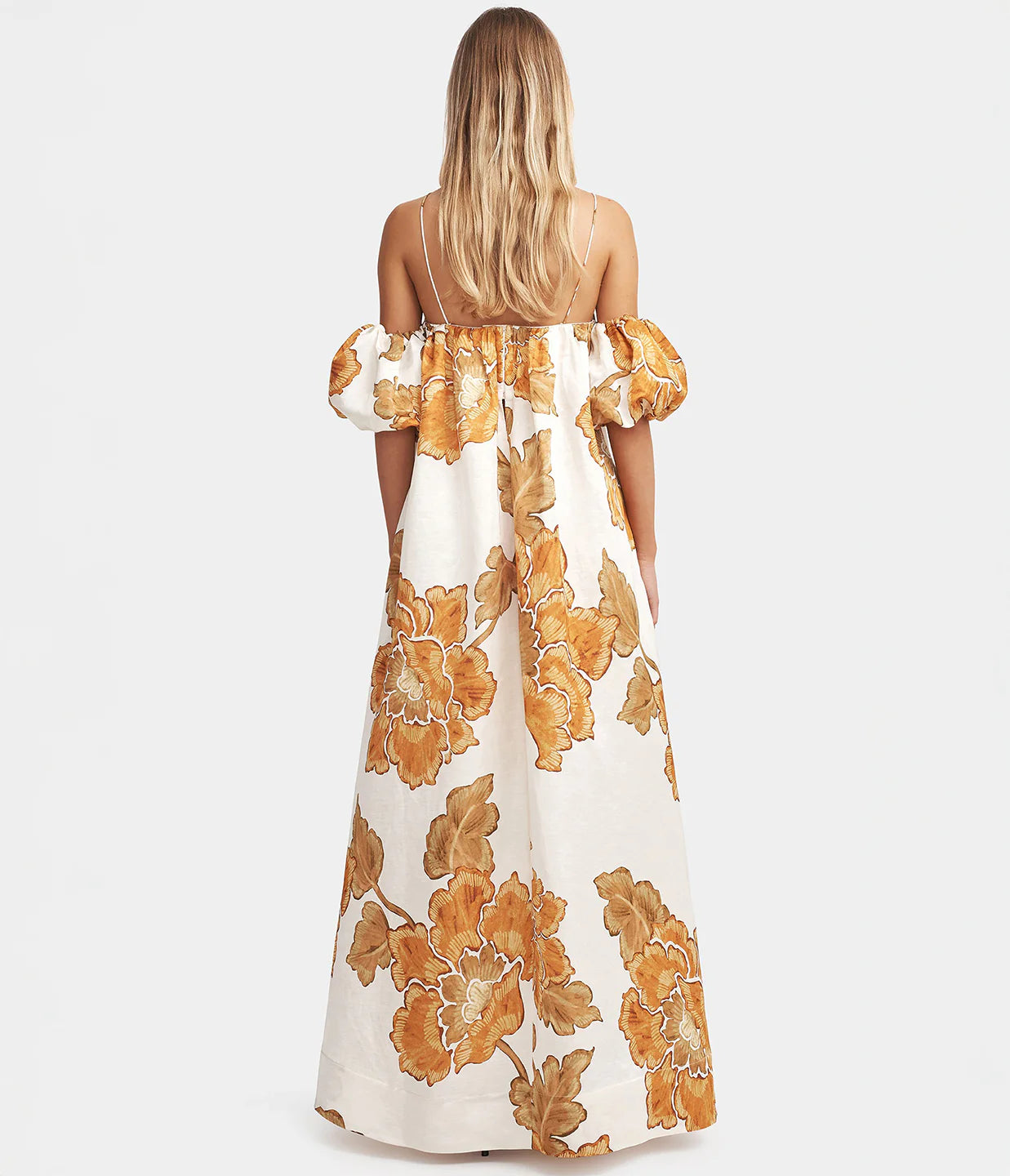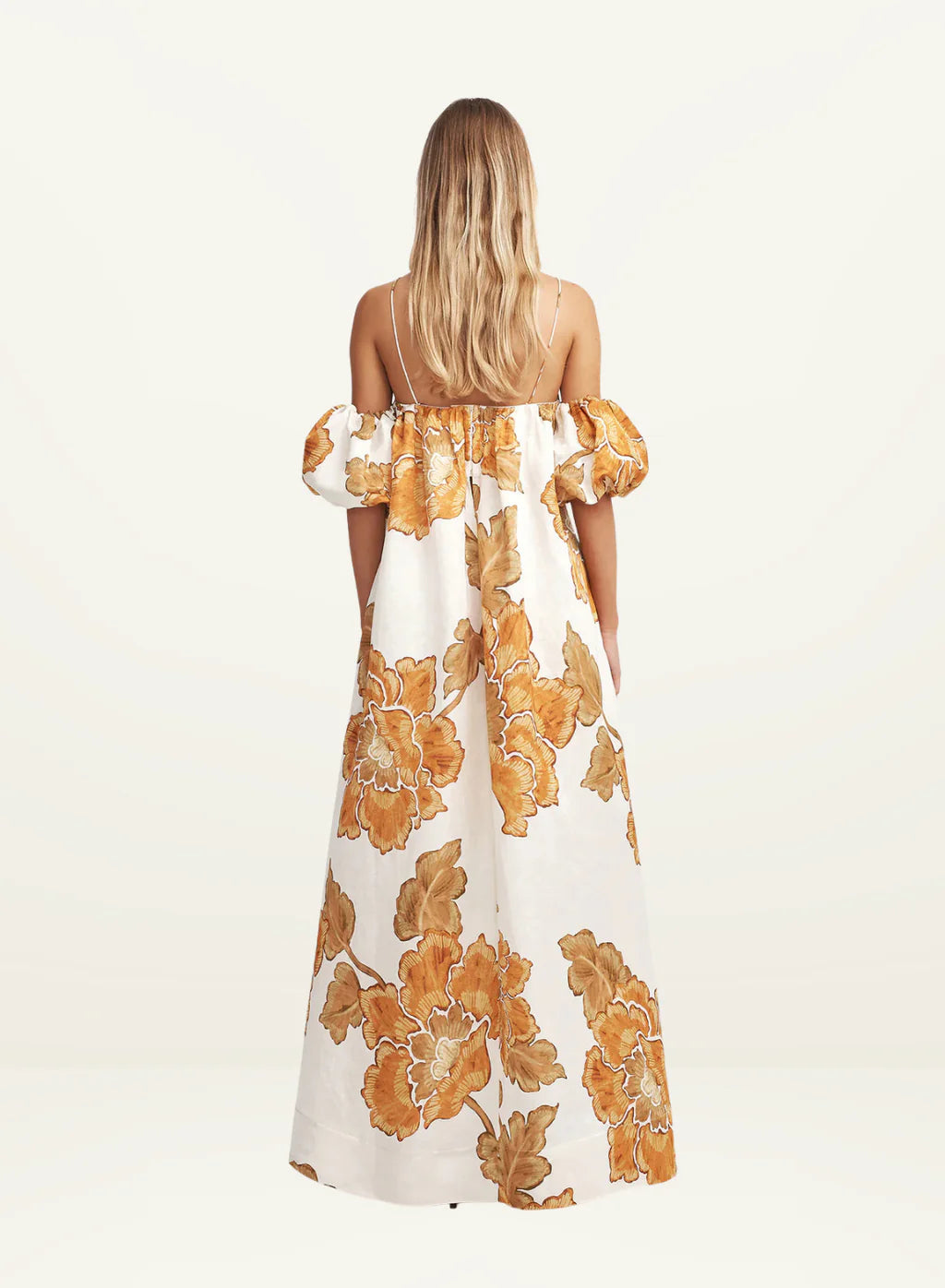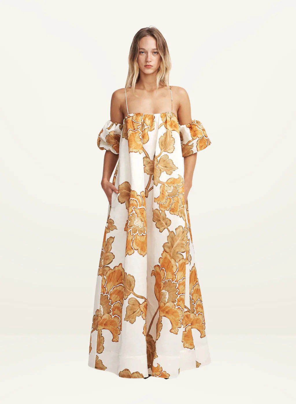The Dress is a gorgeous voluminous maxi length dress with a low straight neckline and detachable puff sleeves. The dress has an A-line shape through the body and is fully lined. Pair with your favourite heels, the is perfect for your next special event.