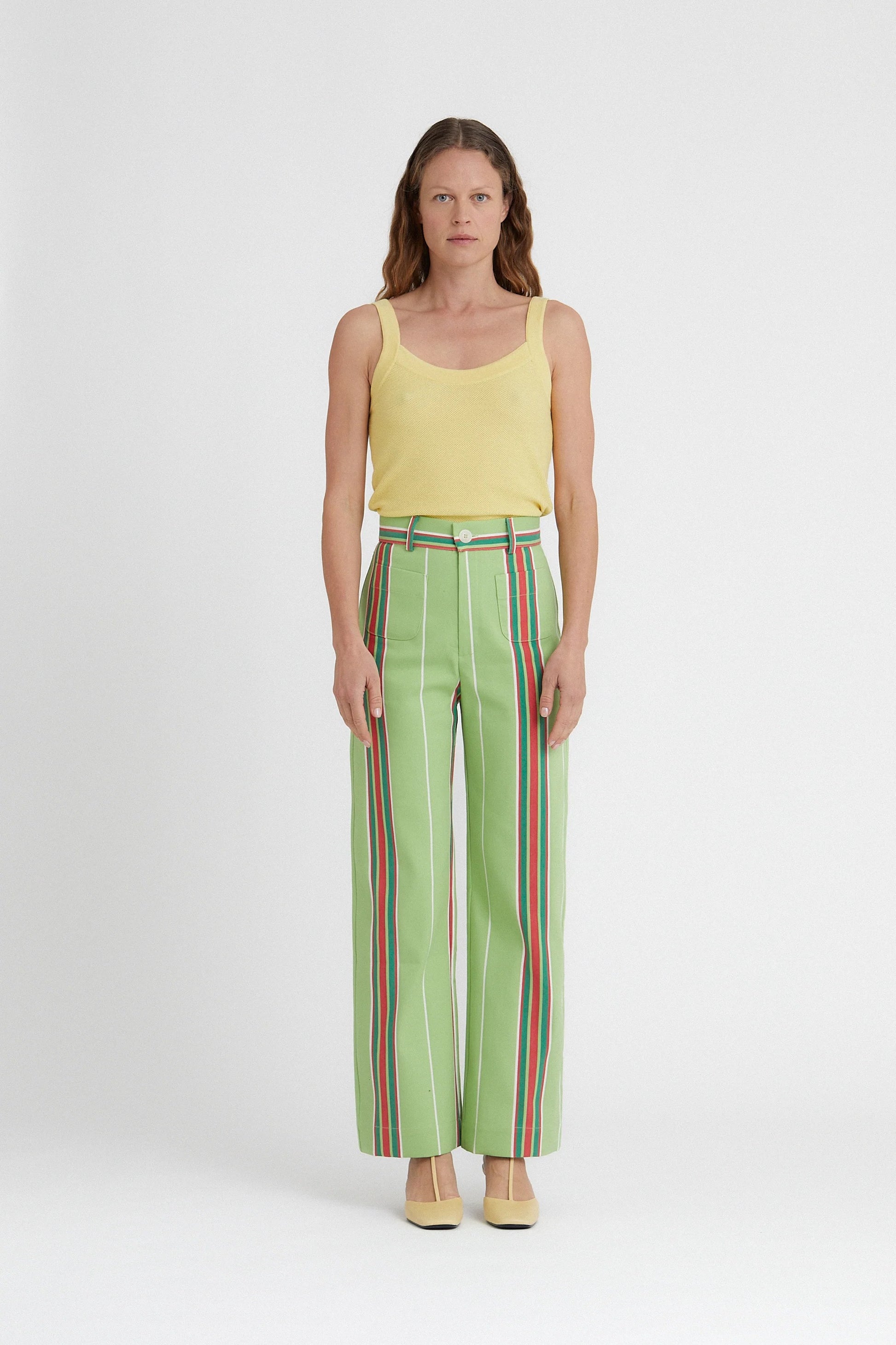 Blue high-waisted printed trousers in cotton with yellow, red and green stripes.