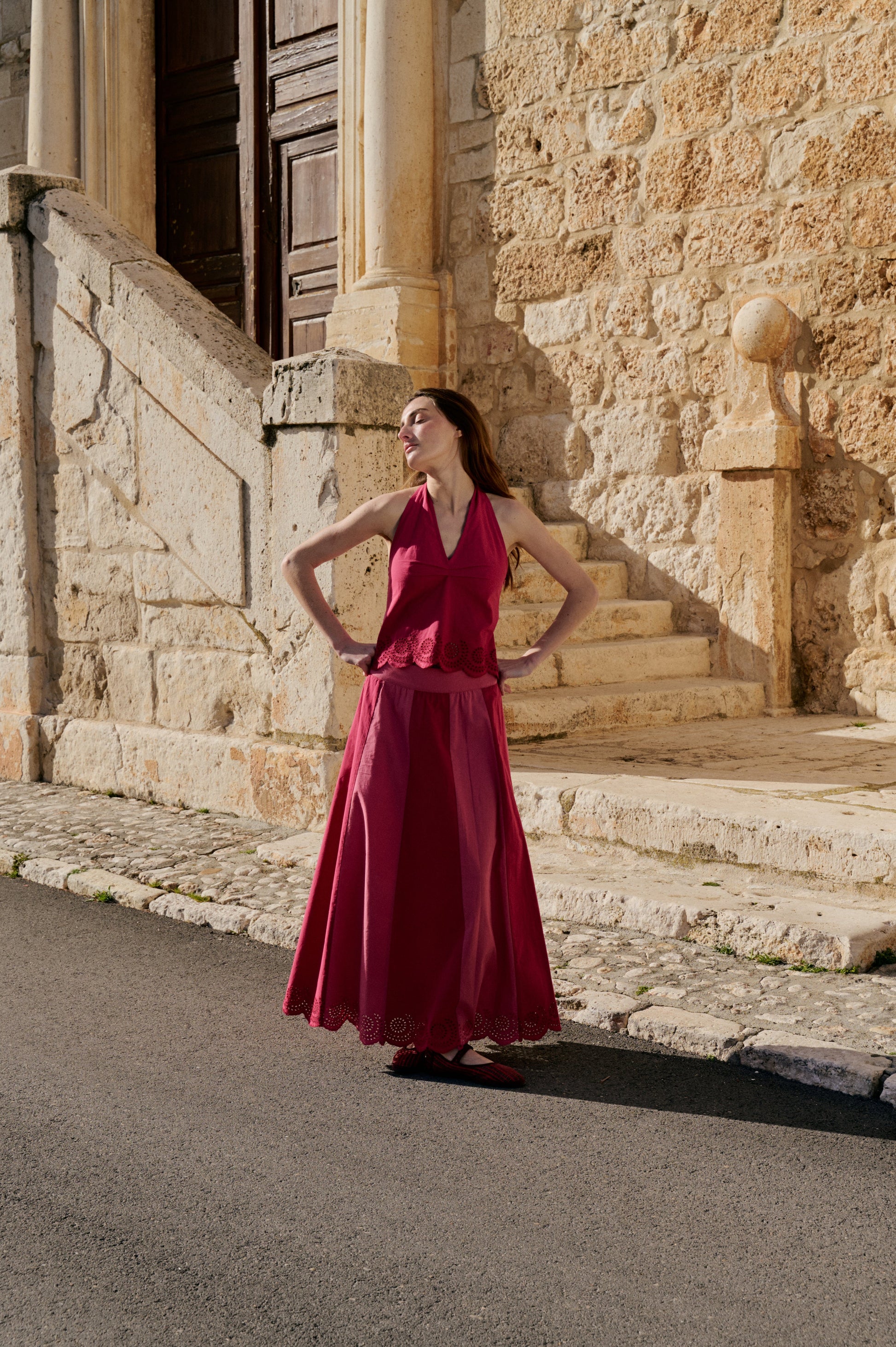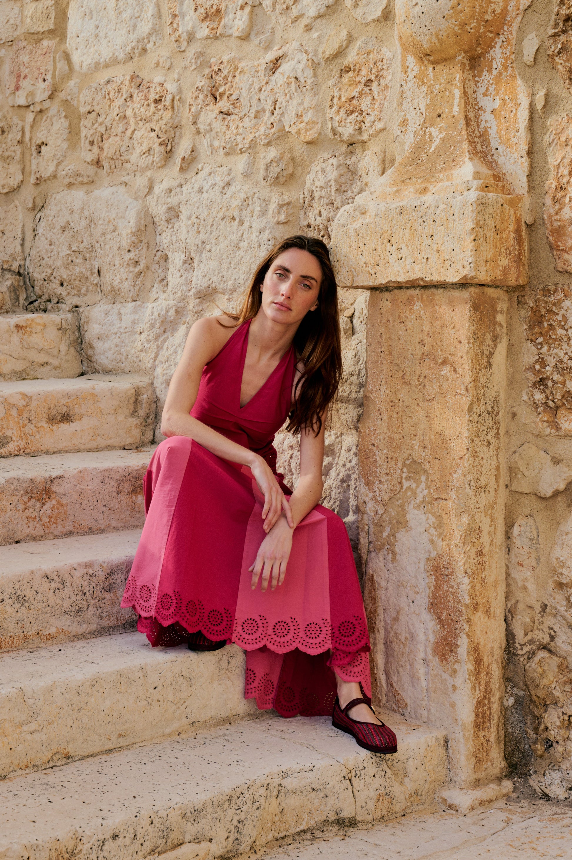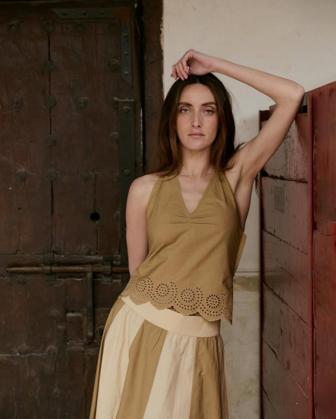 Open back top ties at the neck. Available in strawberry and beige. Top loops to adjust the design. V-neck with center pleat. Slim fit in the same color as the fabric. Low profile, domed shape.