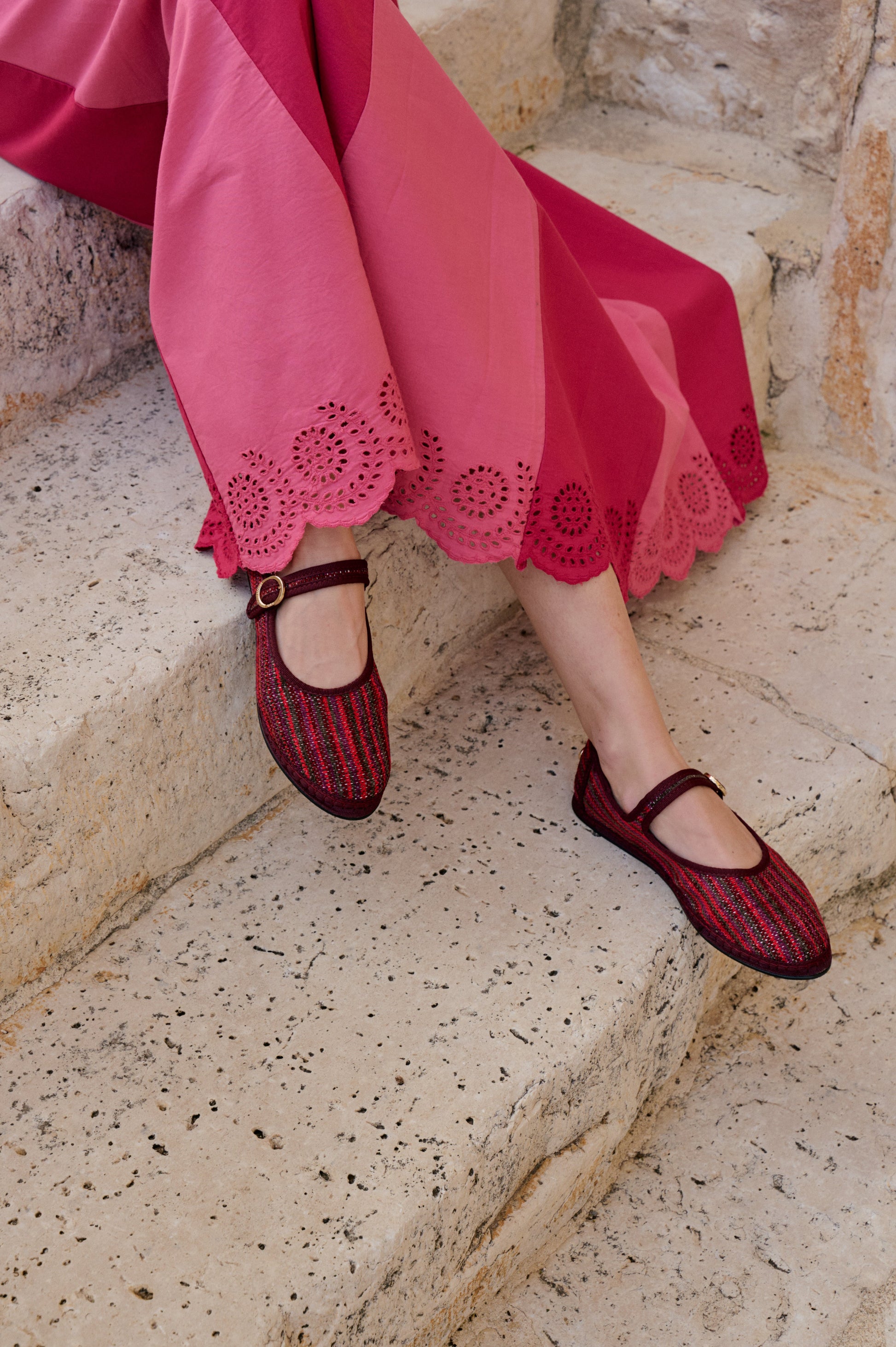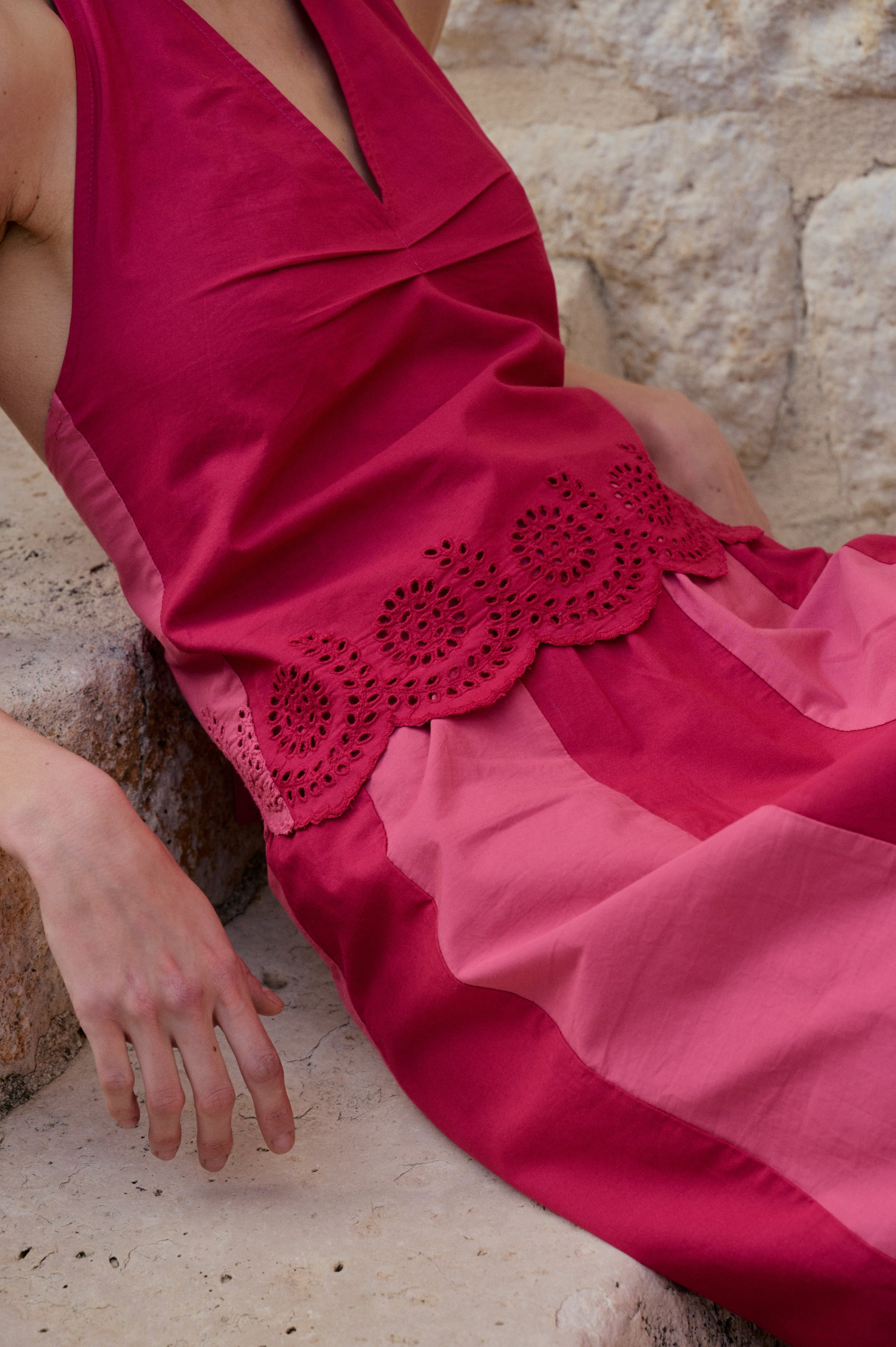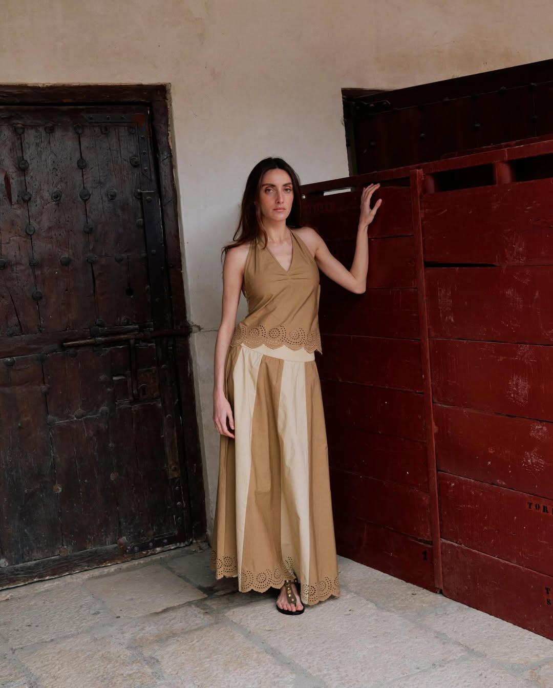 Open back top ties at the neck. Available in strawberry and beige. Top loops to adjust the design. V-neck with center pleat. Slim fit in the same color as the fabric. Low profile, domed shape.