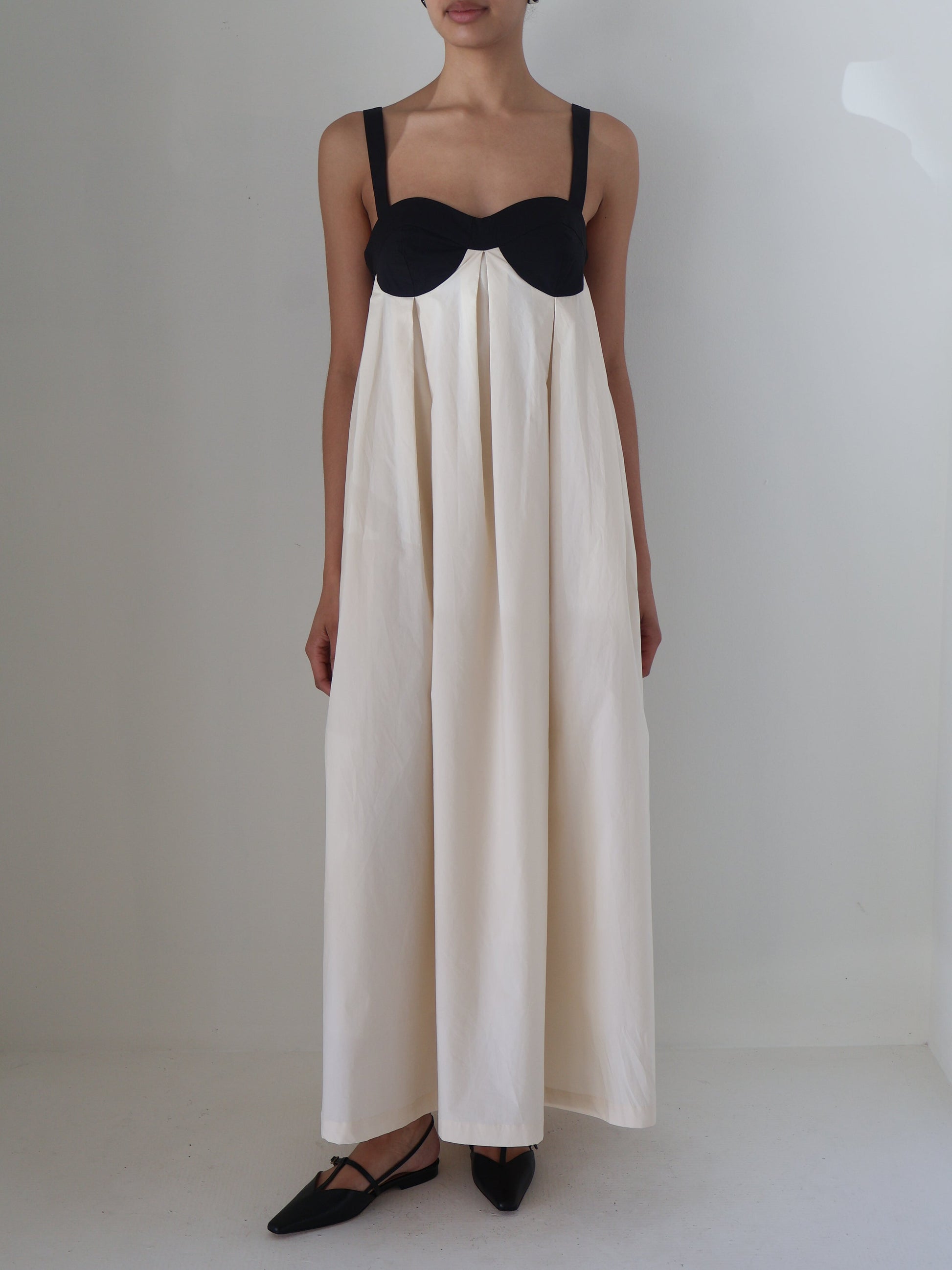 The Amelia dress showcases graceful box pleats throughout in a serene sea salt hue. It is designed with a striking black bodice, a low scoop back accented with a delicate tie detail, and convenient side seam pockets. The sleeveless maxi silhouette exudes effortless sophistication.