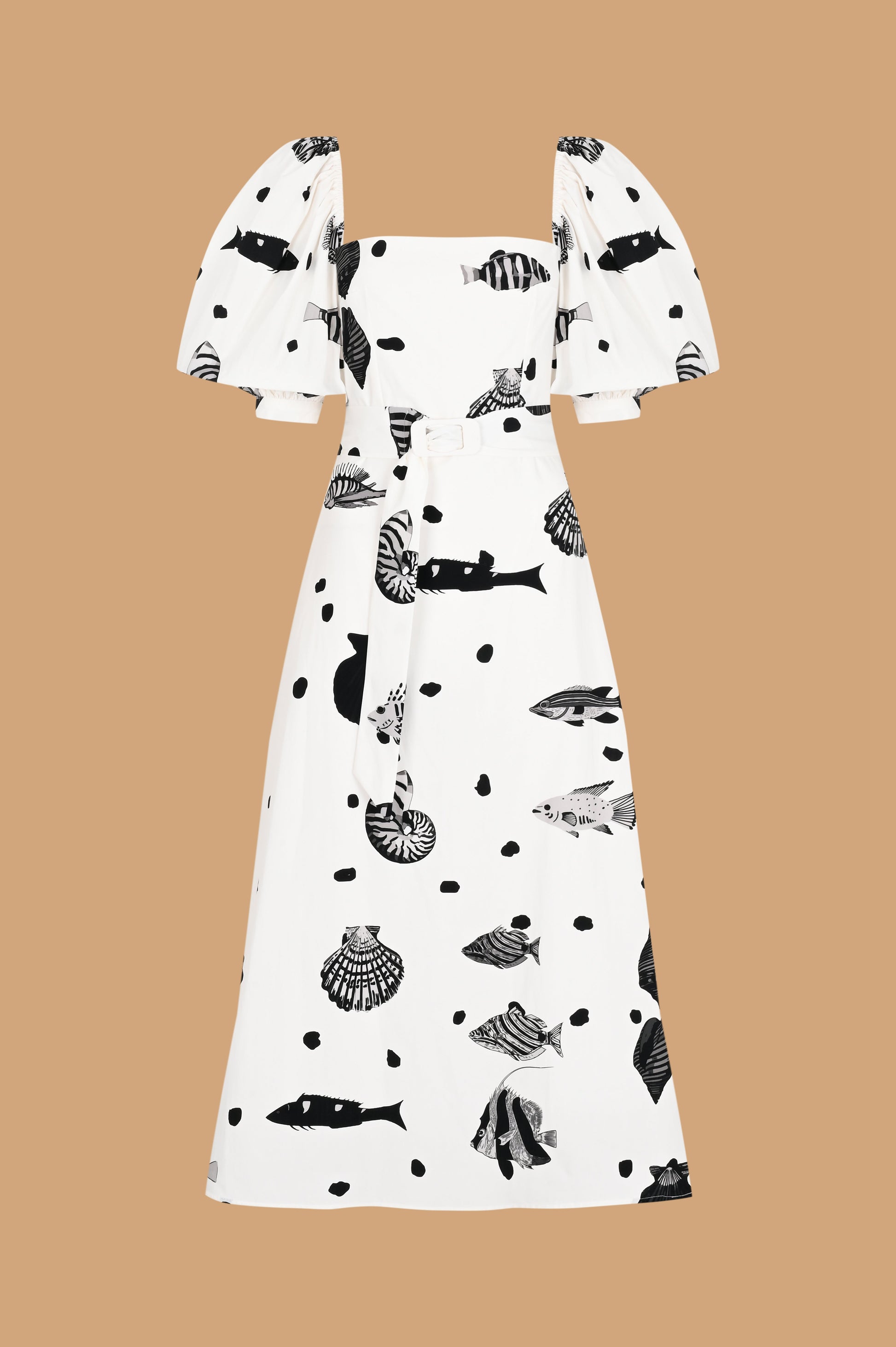 100% cotton. Long dress with full elastic at the back, balloon sleeves, and a belt. The model is wearing a size XS.
