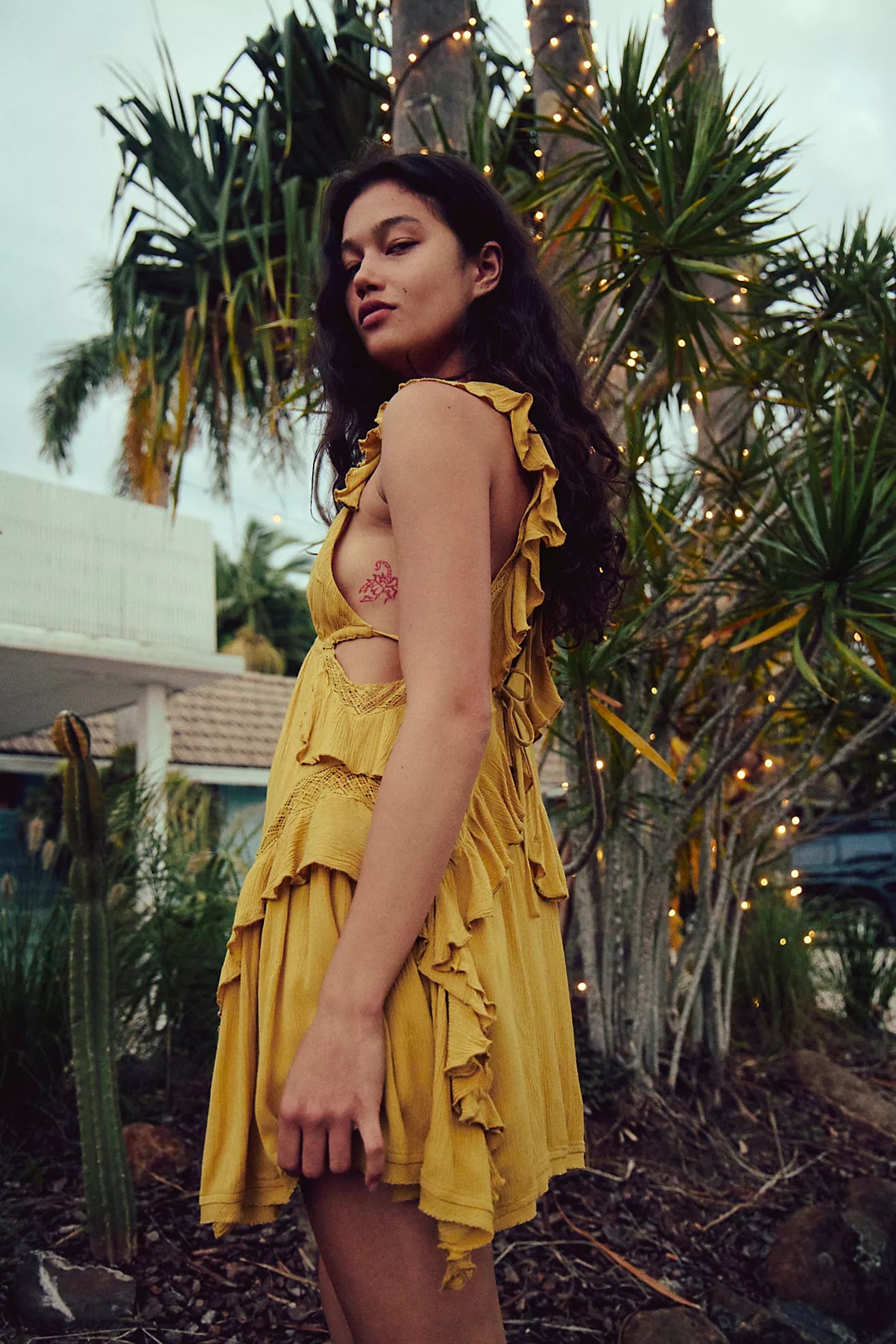 Features: V-neckline, seamed underbust, dropped armholes, ruffle trimming throughout