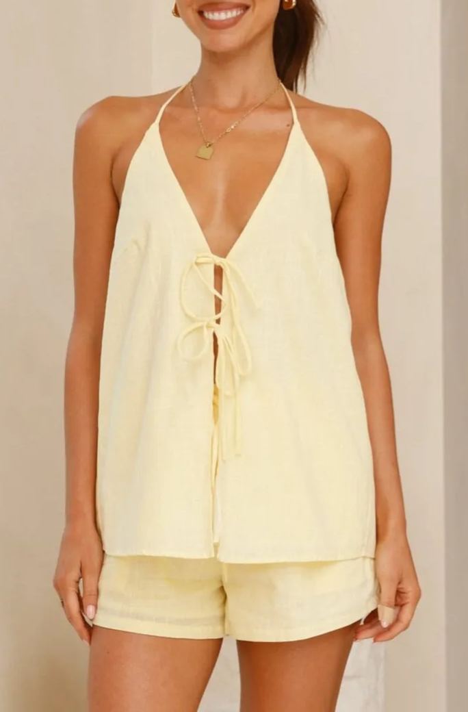 for a fresh take on a vest our Top is loose fitting with tie up details at the front and back, match this with our Short for the complete look.