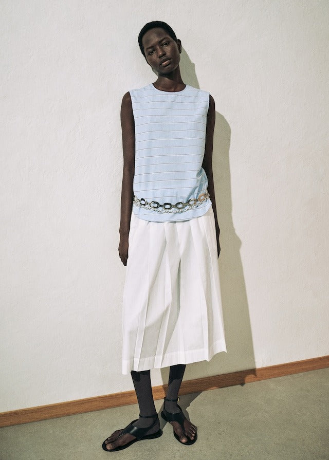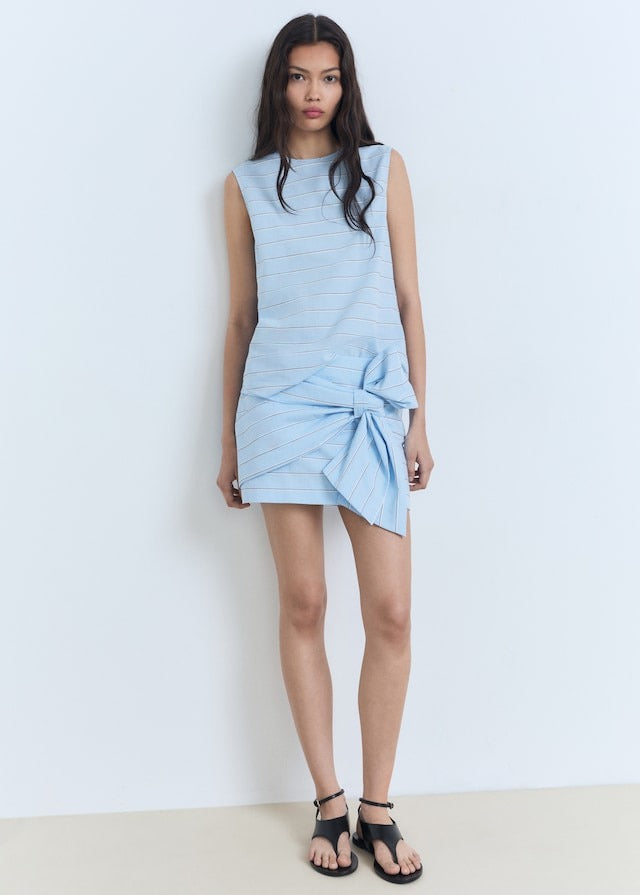 100% cotton fabric. Short design. Straight design. Striped print. Knot detail at the front. Side zip closure. Total look.