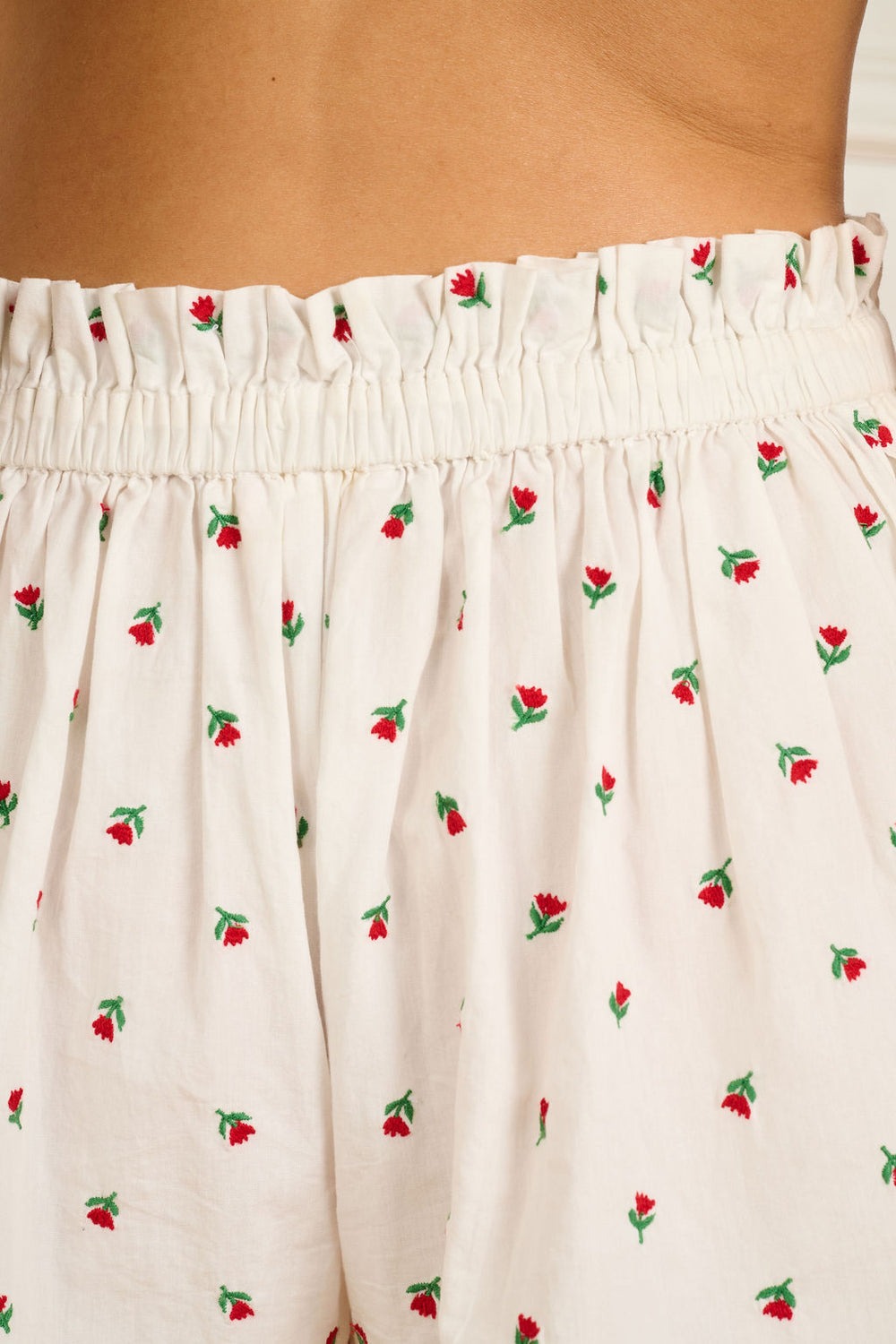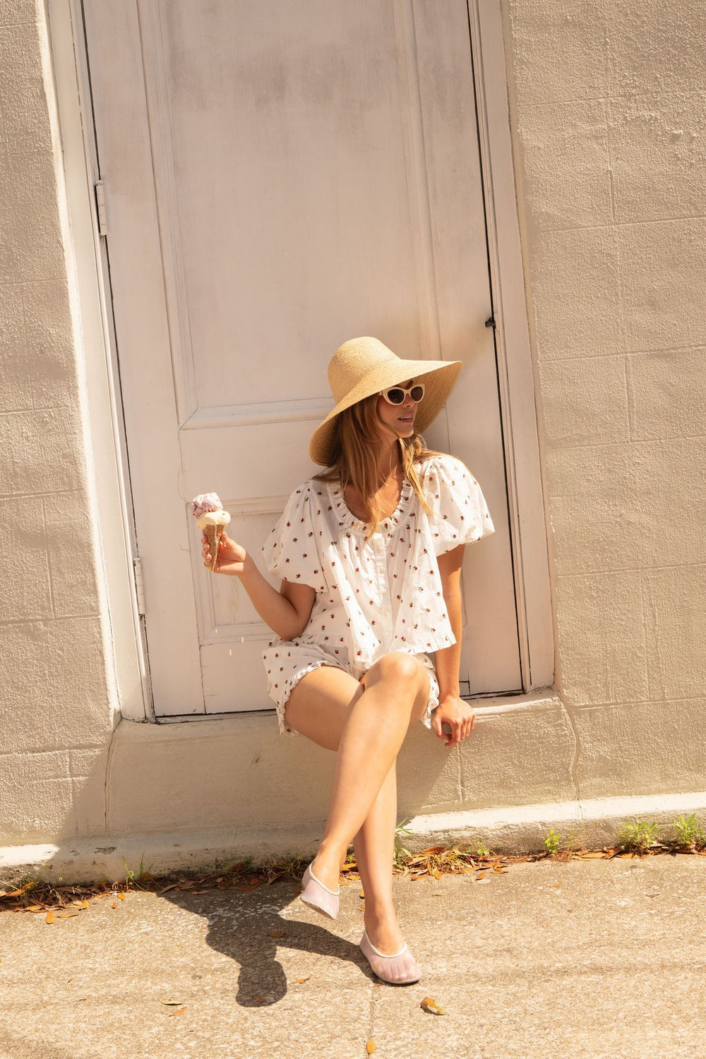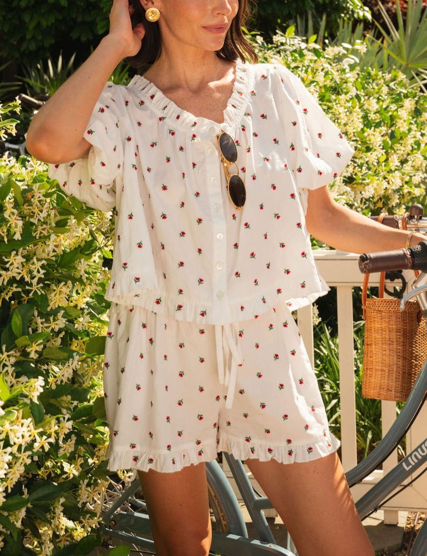 The Charlotte Blouse exudes playfulness and romance with its ruffle-adorned neckline, wider body and puff sleeve. Embroidered with an all-over delicate flower, this blouse is a cute and stylish addition to any wardrobe.
