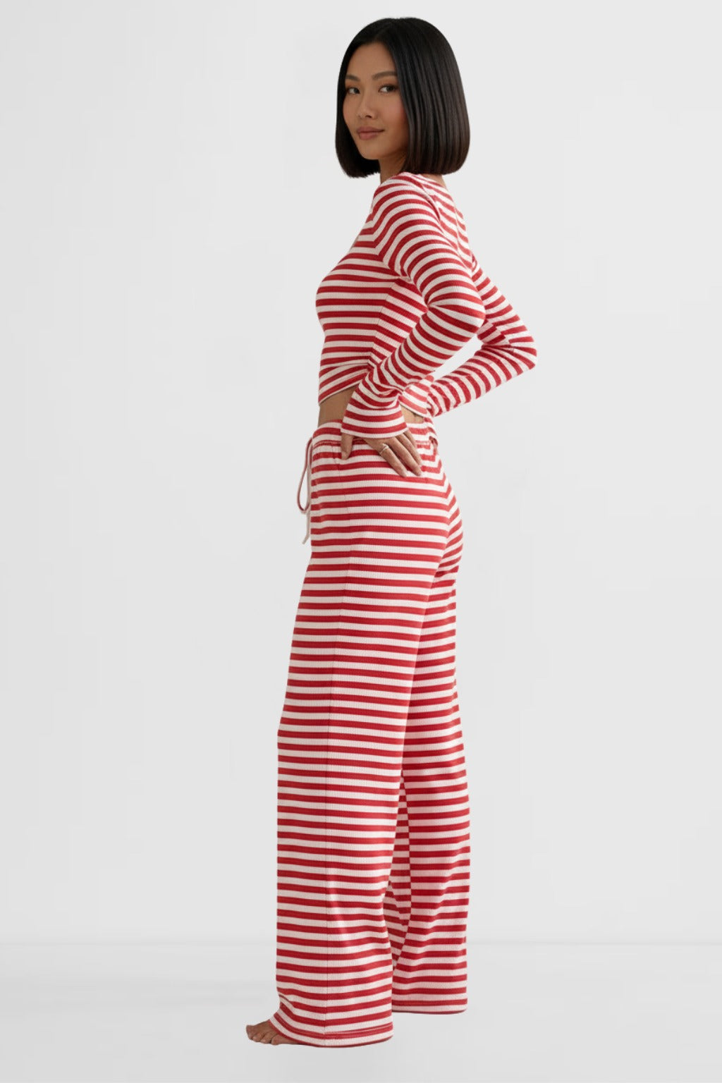 Wide-leg trousers create a fluid, elongating line.