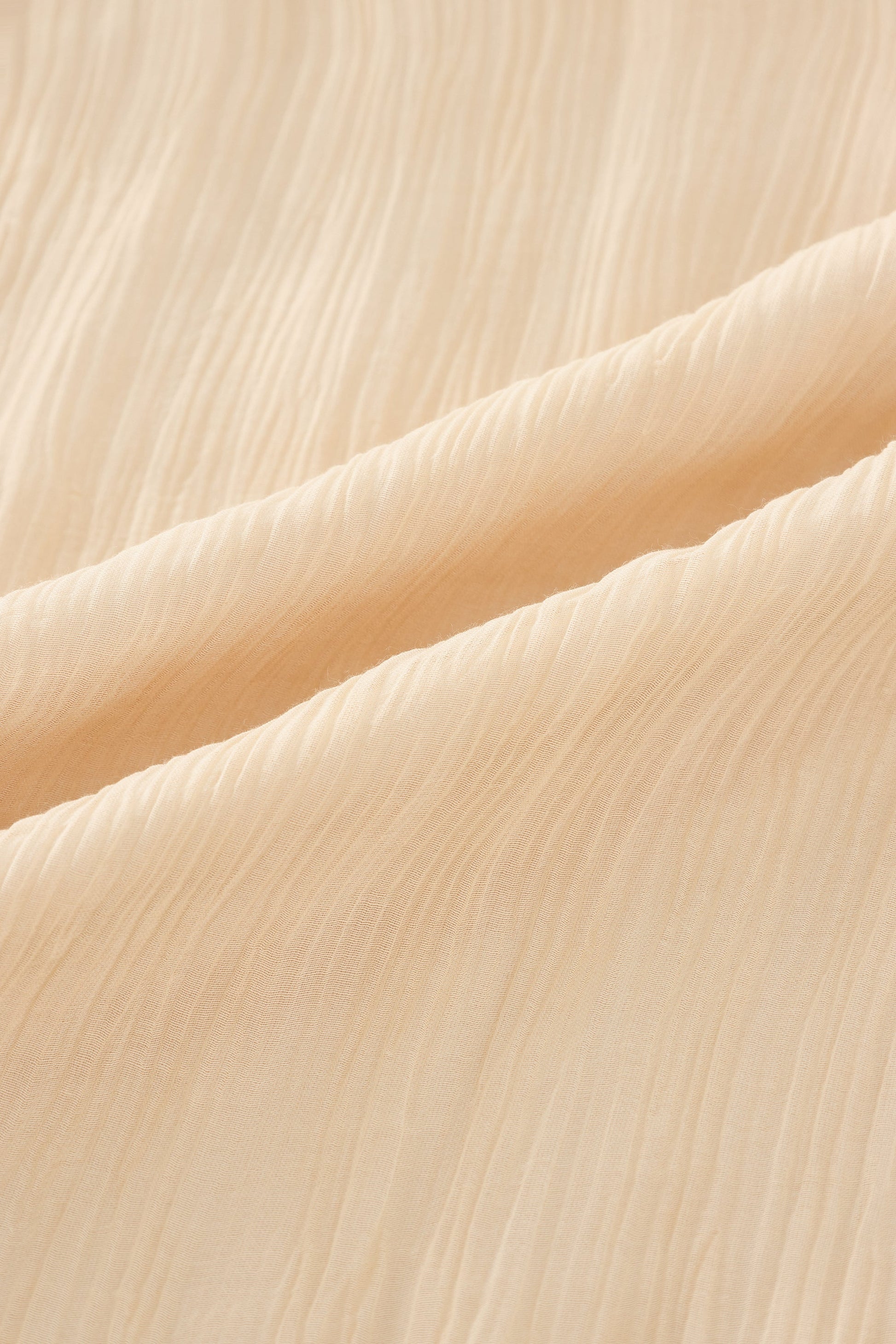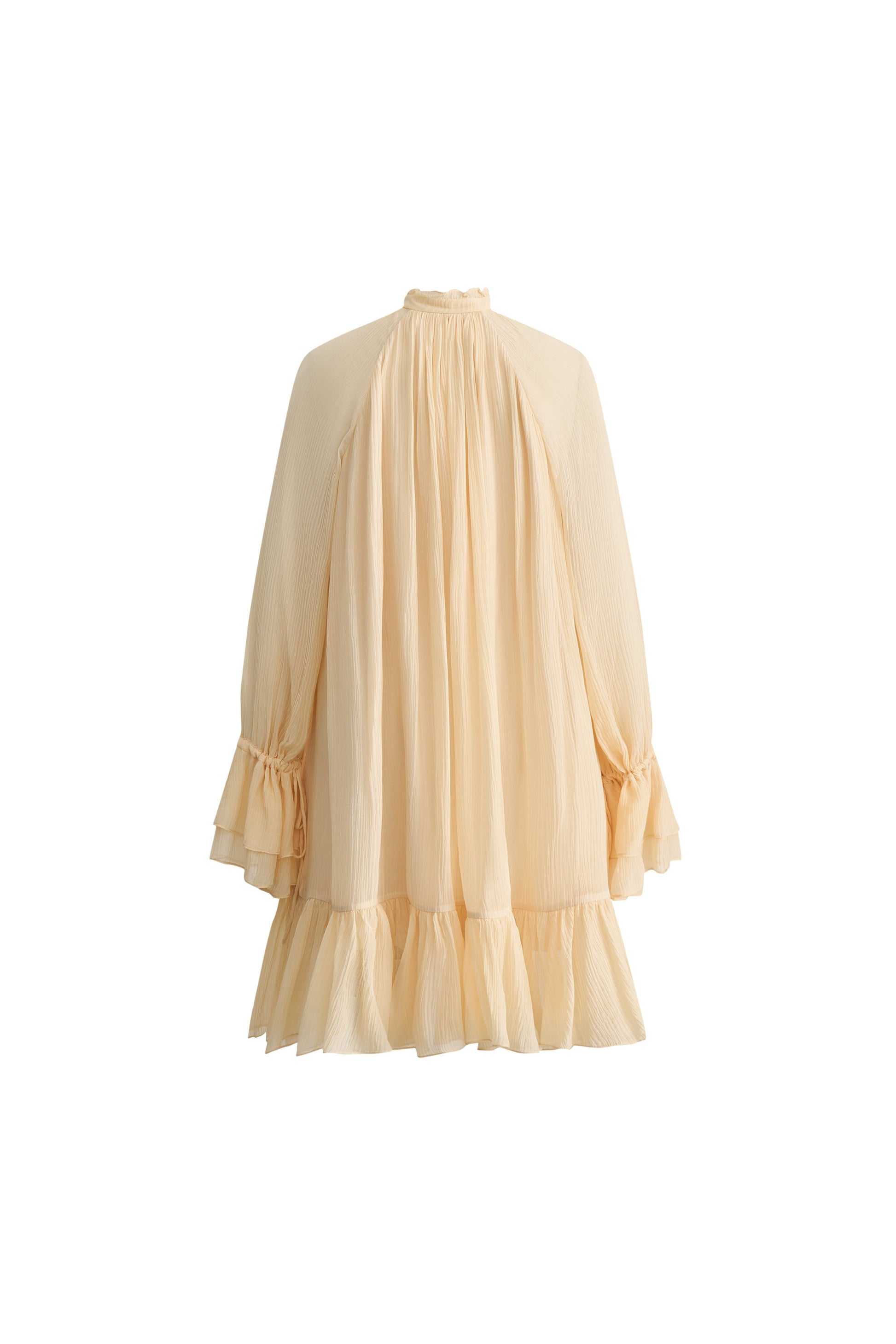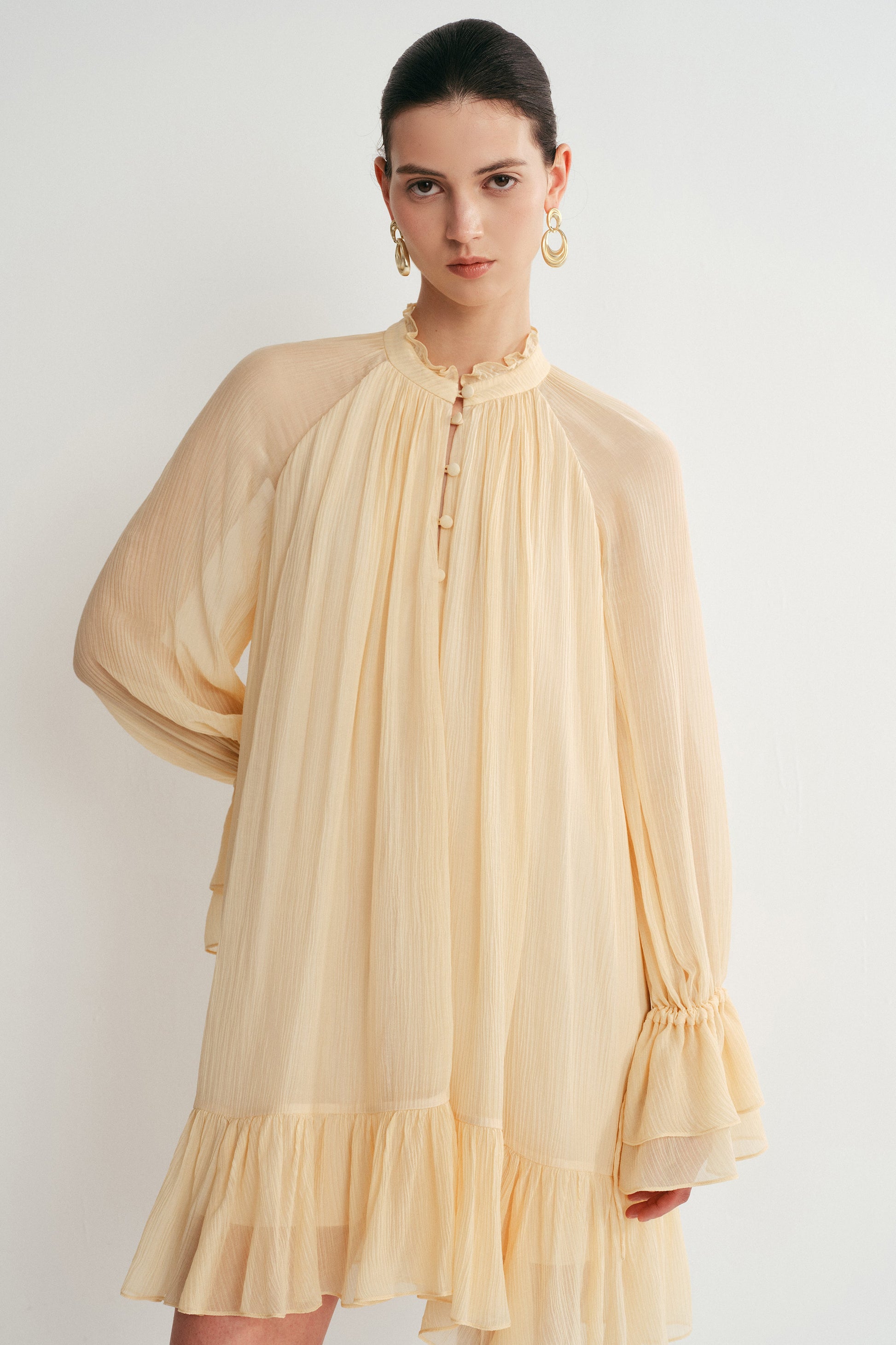 With a delicate ruffled neckline and romantic, flowing cuffs, this dress adds a touch of formality to daytime wear. Fabric buttons add thoughtful detail, and the flowing silhouette dances gracefully with every step. The pale yellow hue catches the golden afternoon sun, perfect for a garden party or summer wedding.